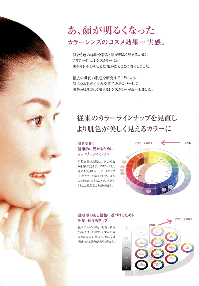 肌色が美しく見えるカラーを選びましょう。男女を問わず、レンズカラーと肌色の組み合わせにより、顔色が悪く見えたり、肌色がくすんでしまうことがあります。
